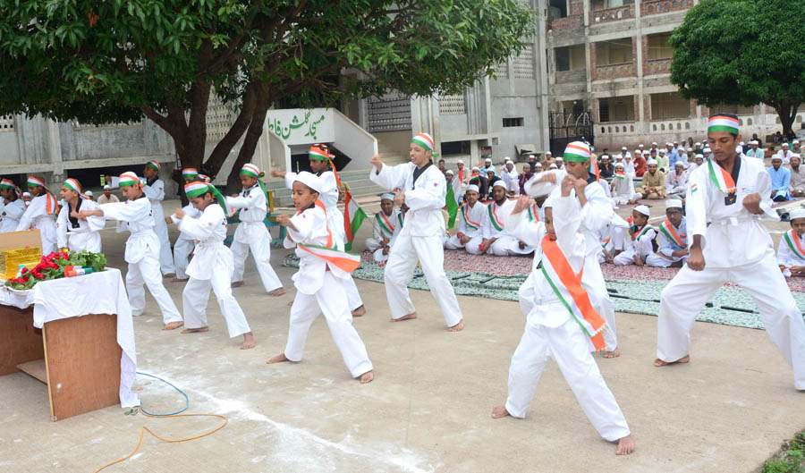 मदरसामधील खेळाडूंनी यावेळी कराटे व तायक्वांदोच्या विविध धाडसी चित्त थरारक प्रात्यक्षिके सादर करुन उपस्थितांच्या ह्रद्याचा ठोका चुकवला. हातात तिरंगा ध्वज घेऊन मानवी मनोरे उभारण्यात आले. कार्यक्रमात विद्यार्थ्यांनी आपल्या भाषणातून सशक्त भारताचे दर्शन घडविले.